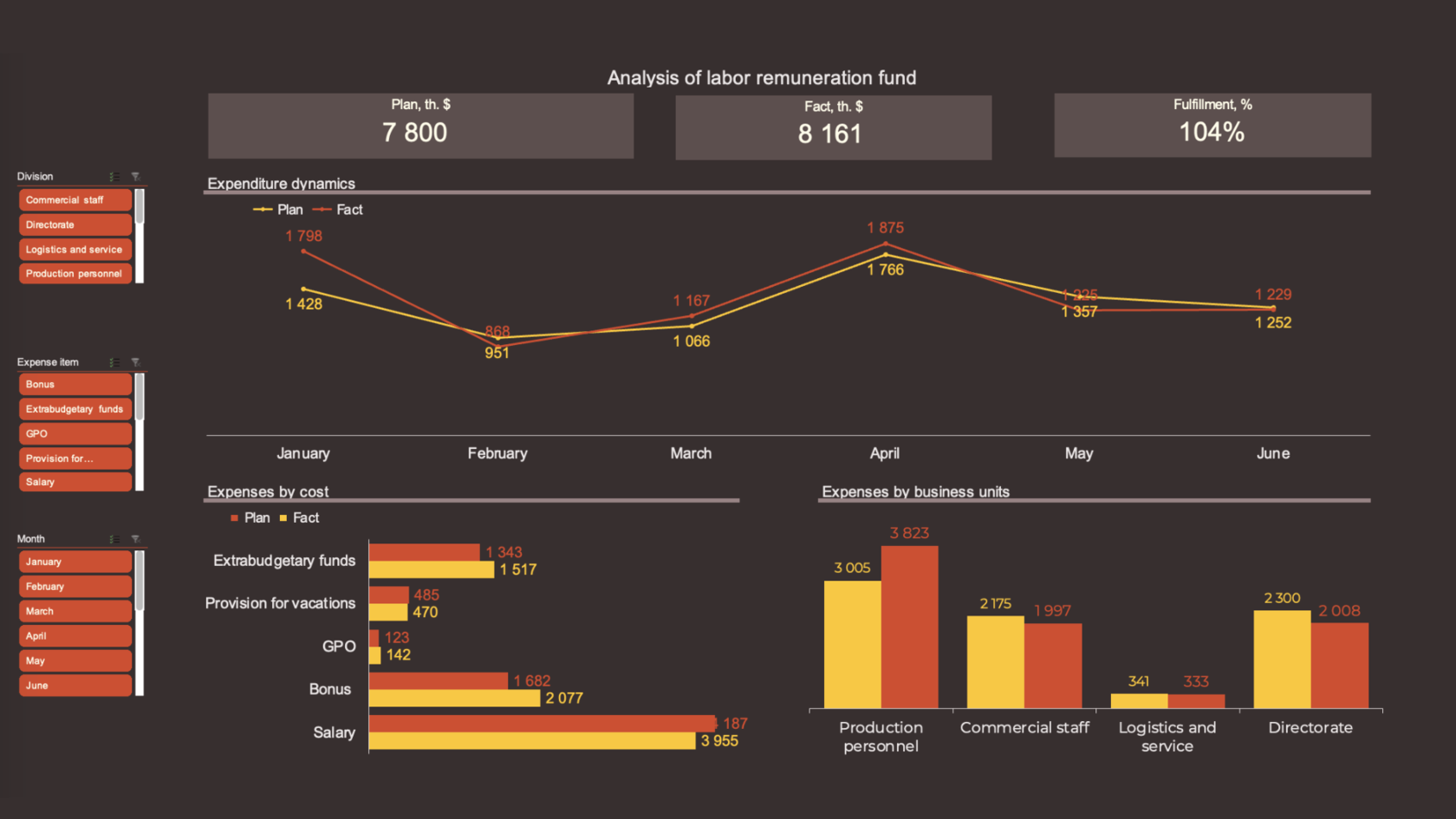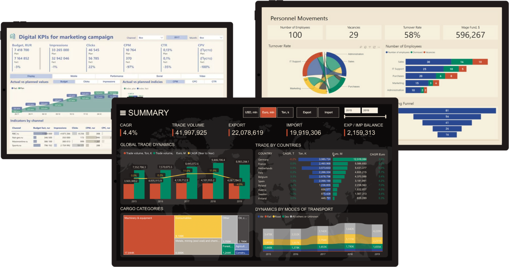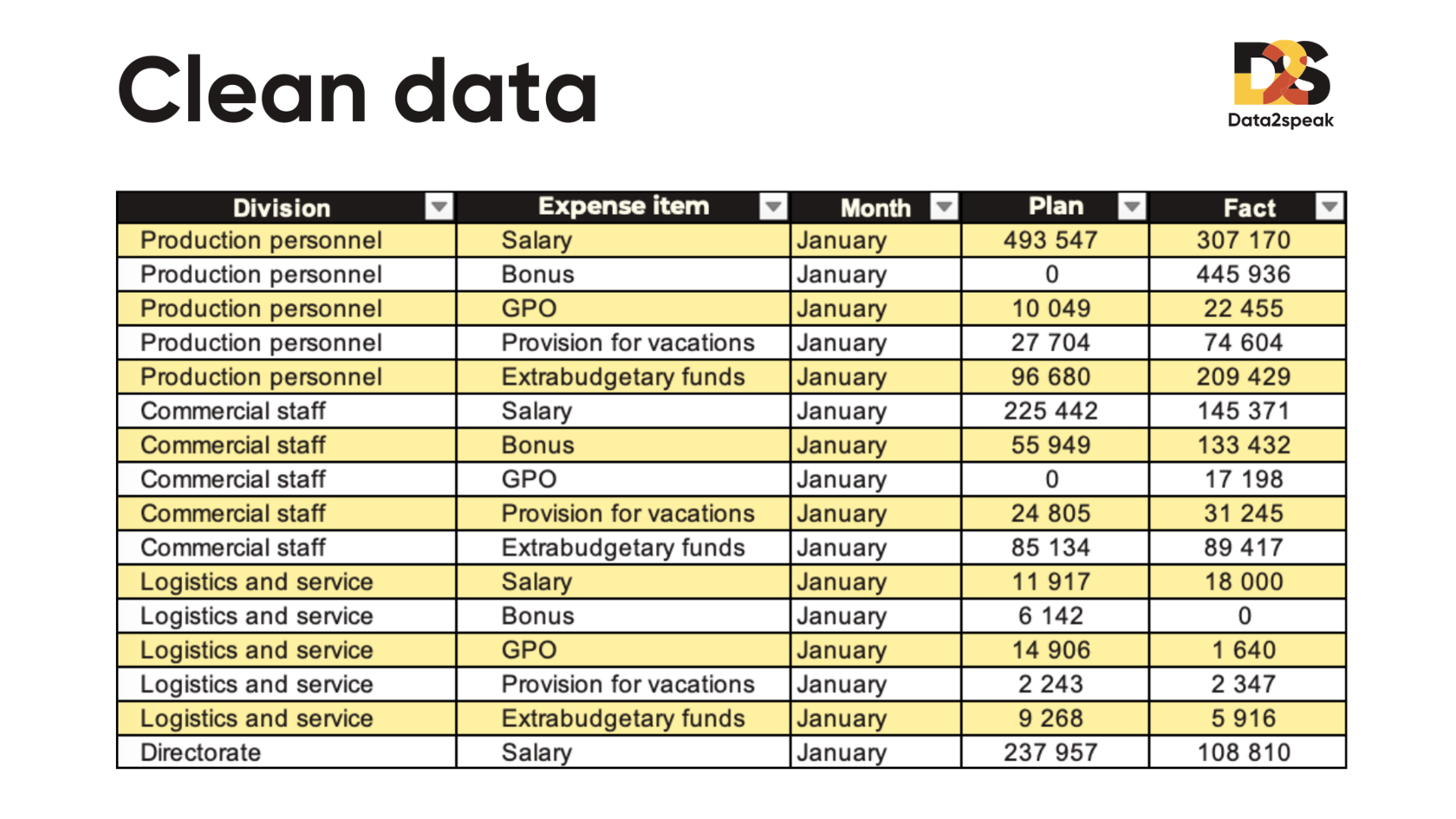 Rules of color coding and accent placement. Creating cards for totals. Lifehacks of data preparation